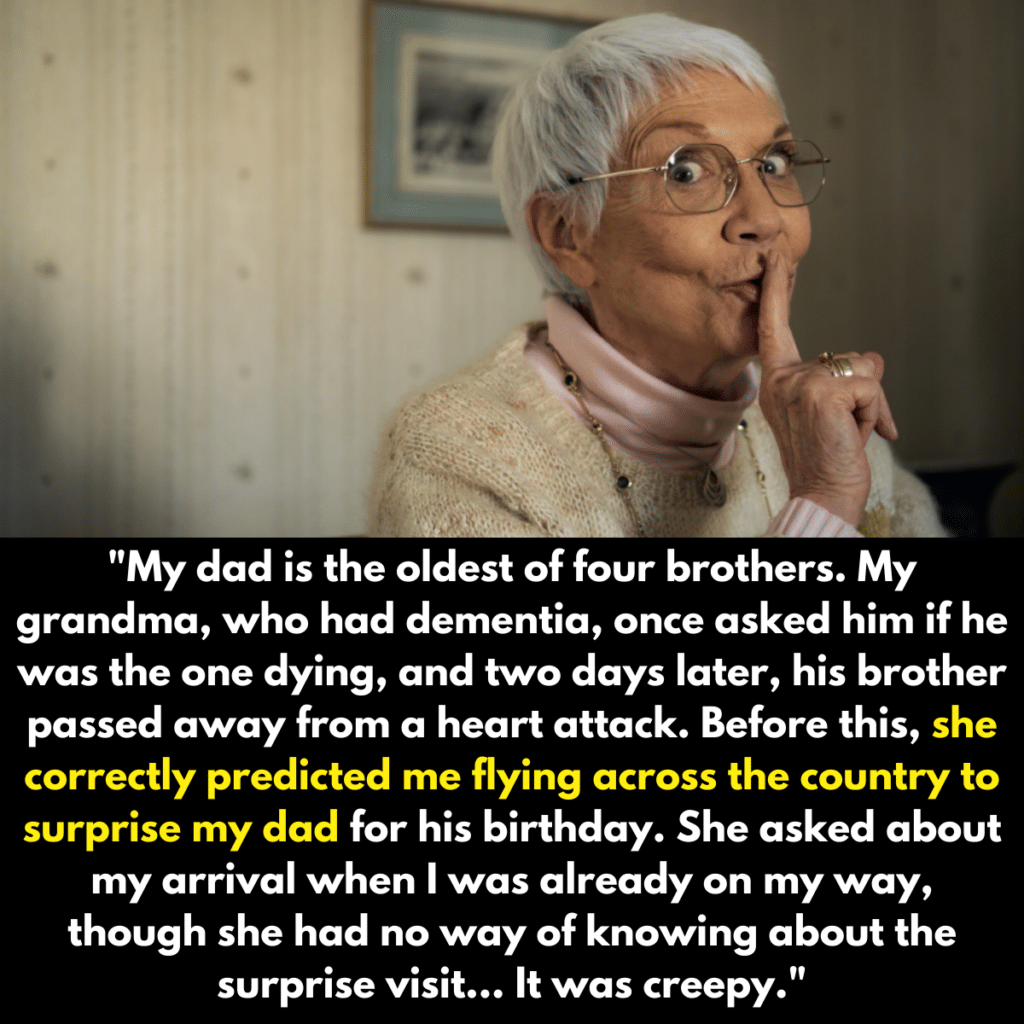 For example, their grandma ominously asked her son if he was dying. What could have been dismissed as a scary dementia-induced question was soon proven right because one of his brothers passed away a couple of days later. On a lighter note, our storyteller’s grandma also knew they were flying home for a surprise visit before anyone else did. While these predictions were undoubtedly creepy, they were also kind of amazing.
